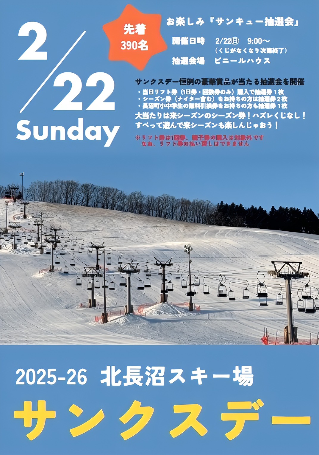 今シーズンのご来場感謝イベントとして、2月22日9:00~11:00の間に、リフト一日券または回数券を購入すると抽選券を1枚進呈。特設抽選会場で三角クジを引いて、プレゼント商品をゲットしてください。先着390名(サンキュ)。空クジ無し‼ *特賞、来シーズン使えるシーズン券・野球観戦チケット・32型tv・他、地元産お米・野菜・食事券・協賛企業商品盛りだくさん❣ご来場をお待ちしております。尚、購入したリフト券の払い戻しは出来ません。