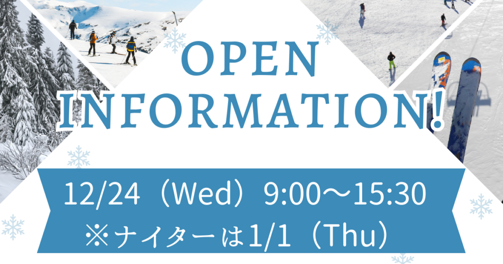 スキー場のオープン予定日が決まりました✨12/24(Wed) 9:00~15:30※ナイターの営業は年明けの1/1(thu)になります!積雪状況により変わりますのでその際はHPやインスタグラムにてお知らせします。 -